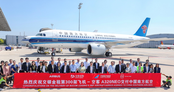 8月23日,交银金租在天津完成第300架飞机交付,将1架A320neo飞机交付至中国南方航空。交通银行首席专家,交银金租党委书记、董事长徐斌,中国南方航空集团有限公司副总经理吴颖湘,空客全球执行副总裁、空客中国首席执行官徐岗,天津东疆综合保税区党委常委、管委会副主任李公良发表致辞祝贺。交通银行天津市分行党委书记、行长郑家渡,交银金租党委委员、副总裁王东出席交付仪式。